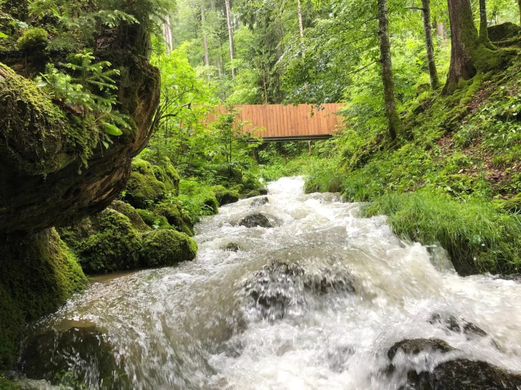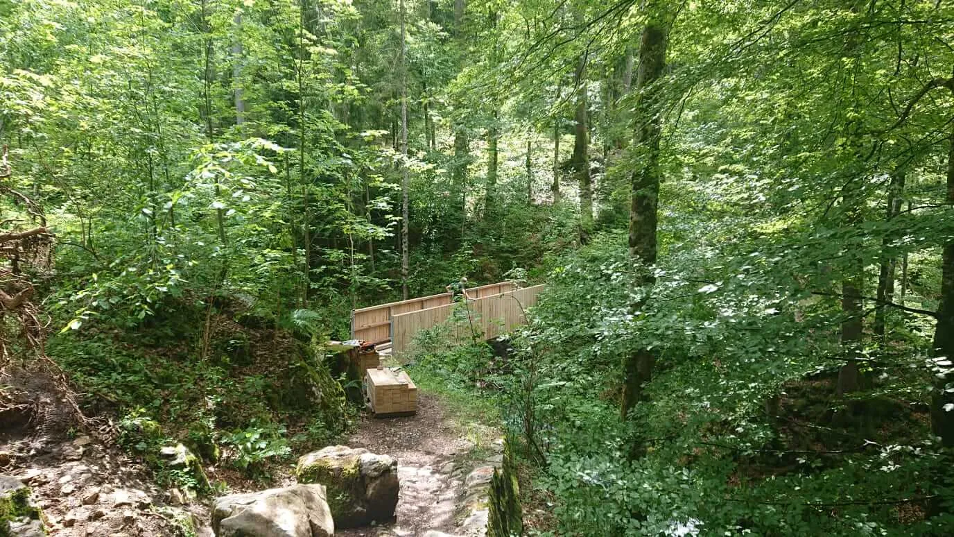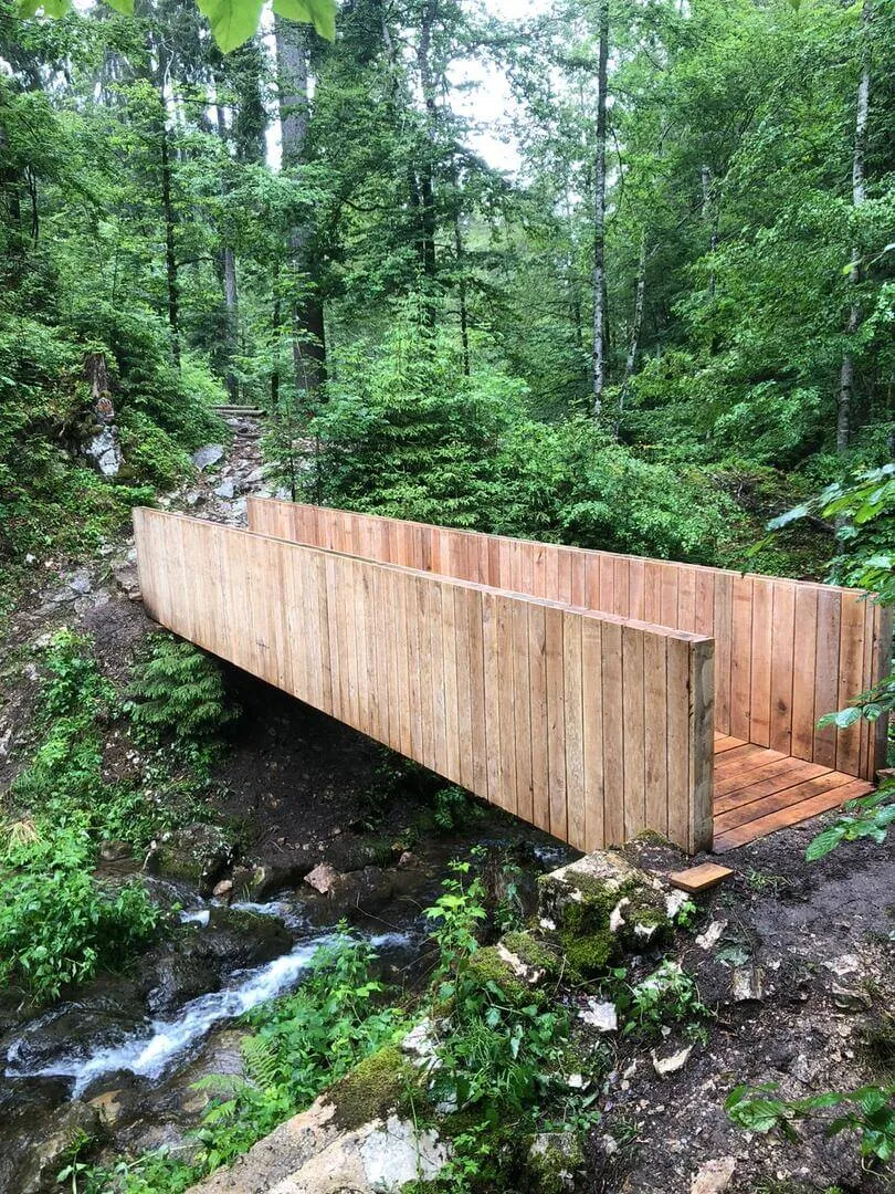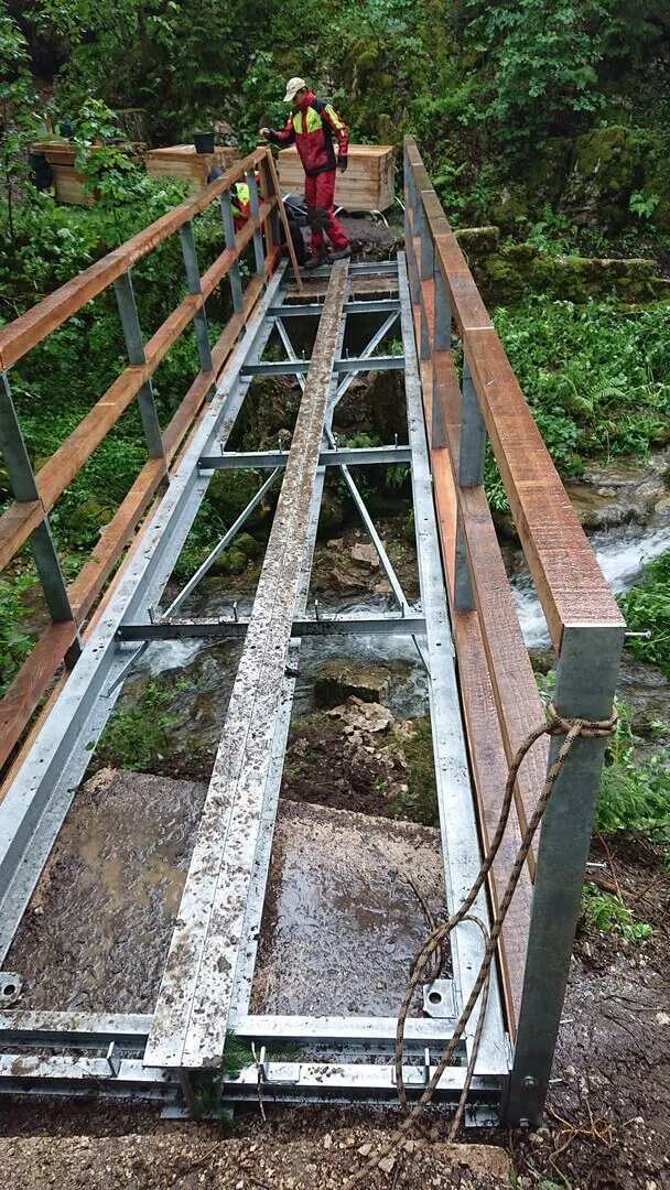 La structure métallique a été mise en place puis complétée par la pose des garde-corps et du platelage bois pour finaliser l’ouvrage.