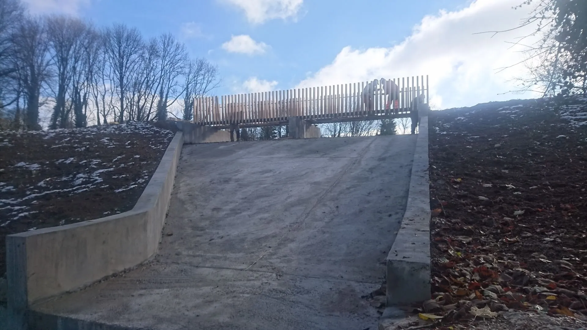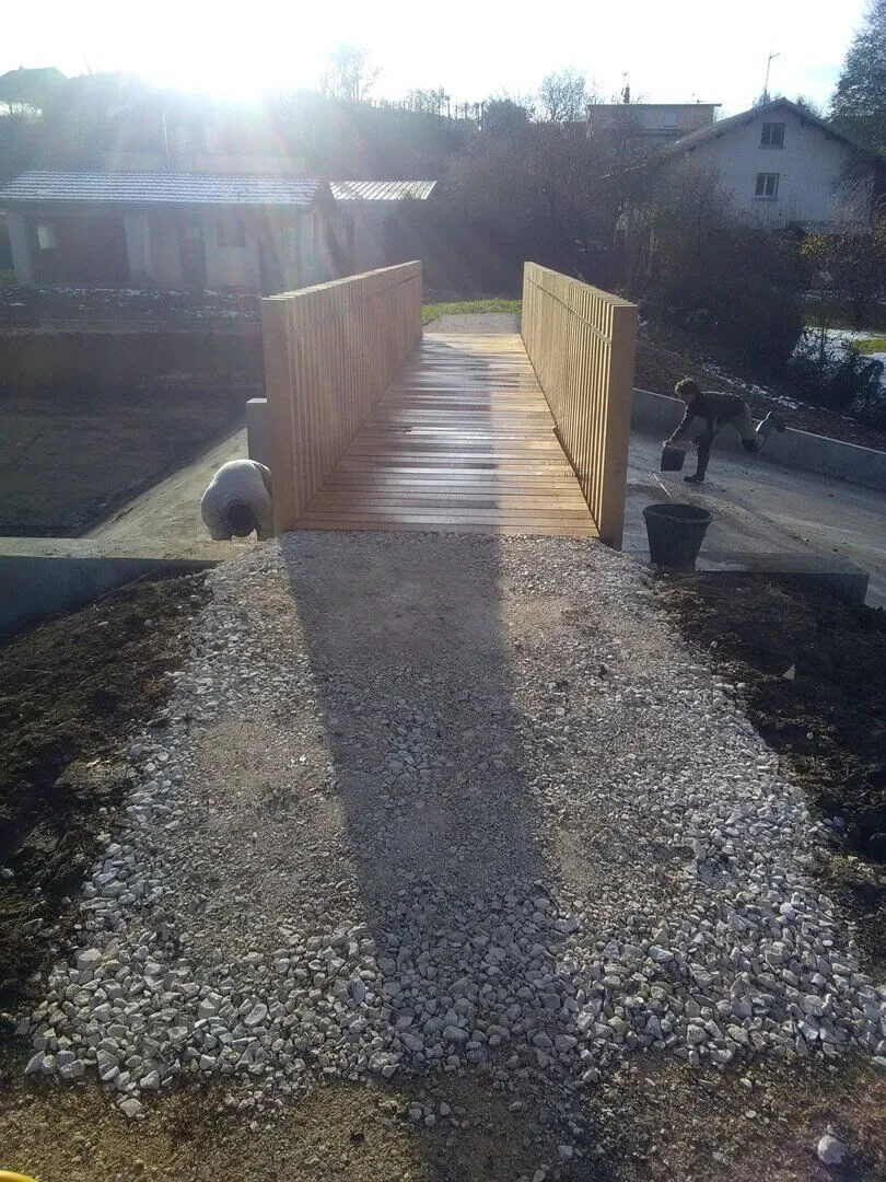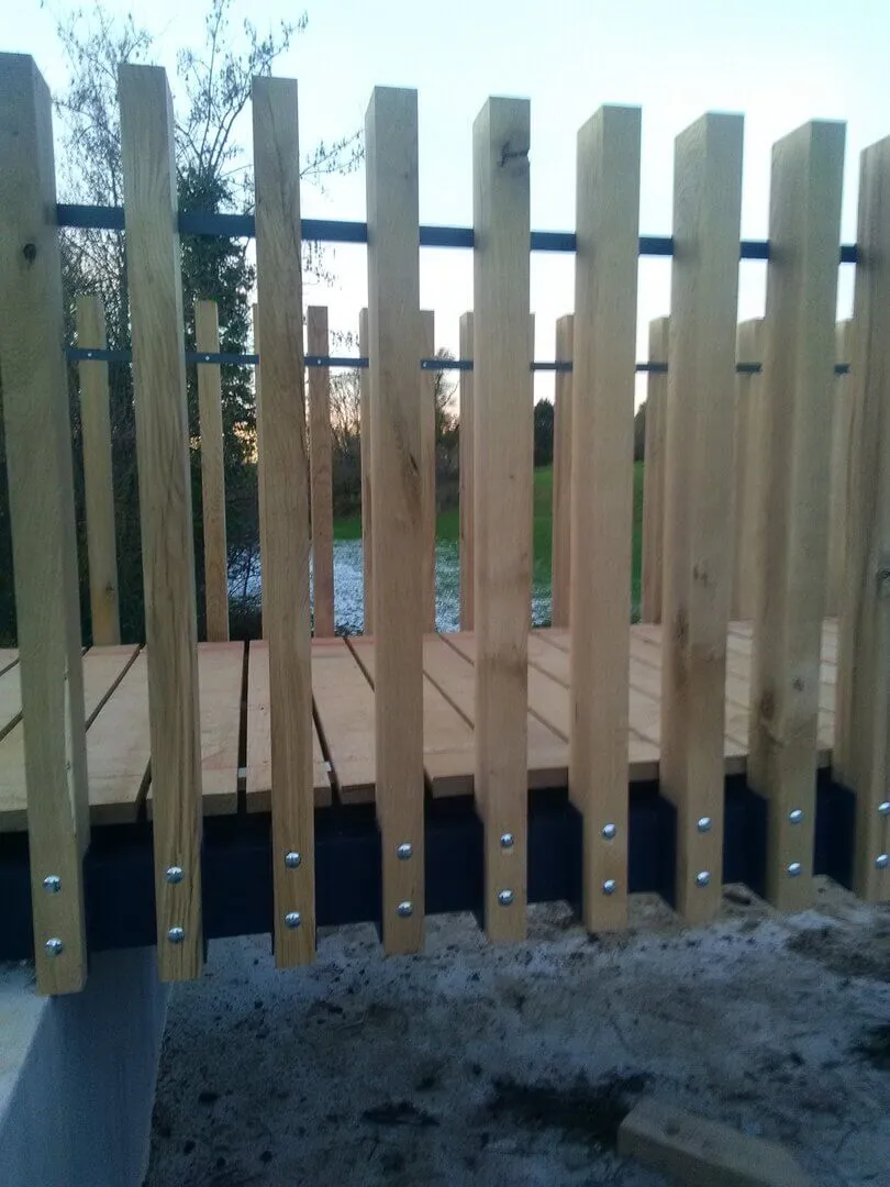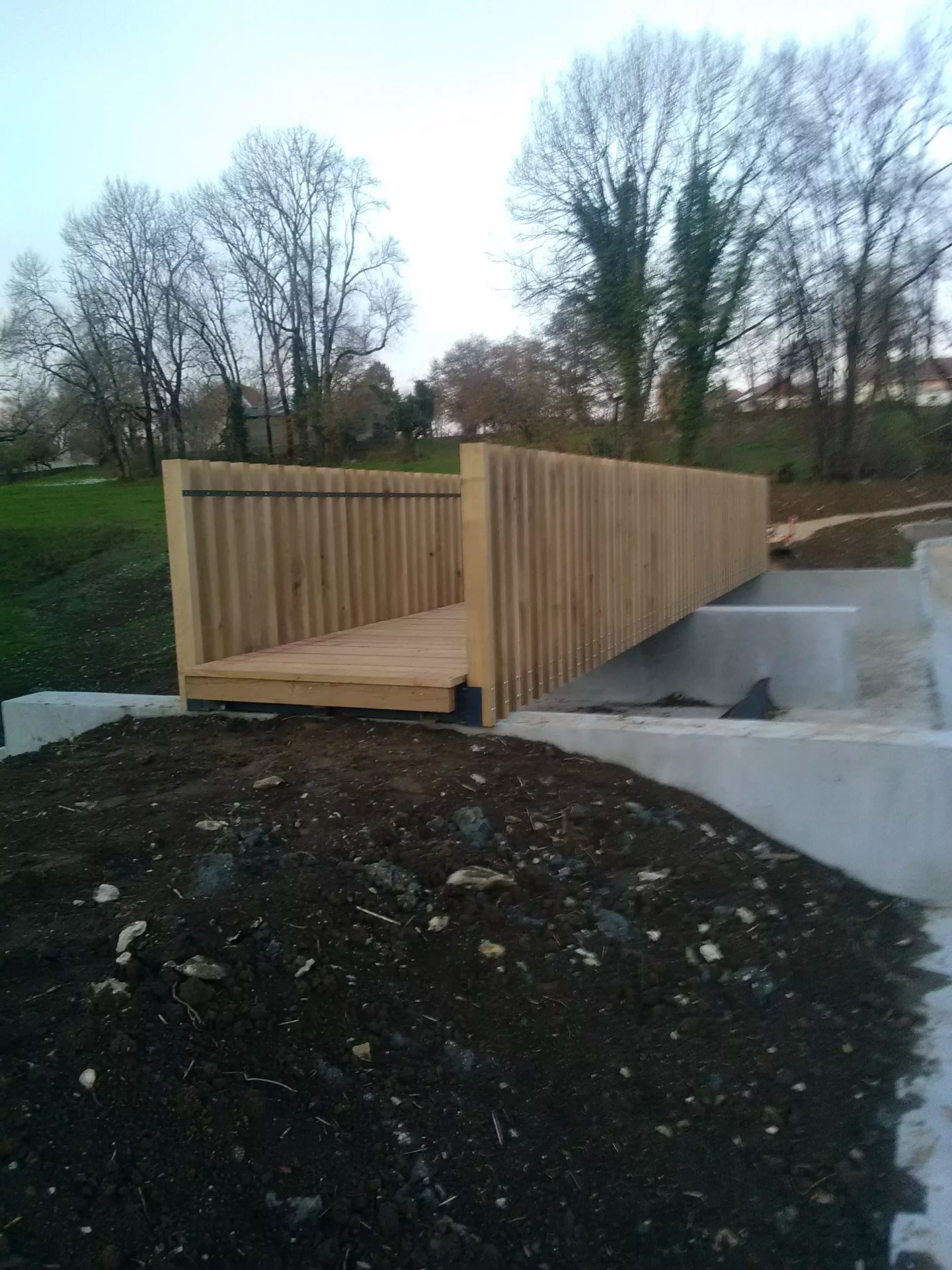 Le platelage et les garde-corps bois sont en chêne non-traité classe IV. Une lisse métallique est incrustée dans les garde-corps de 1,10 m de hauteur pour assurer la sécurité des usagers.