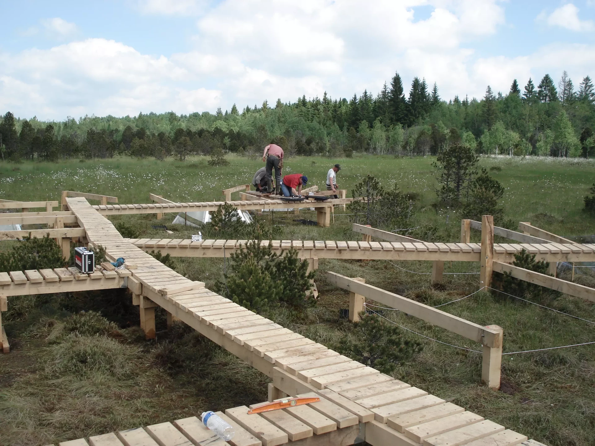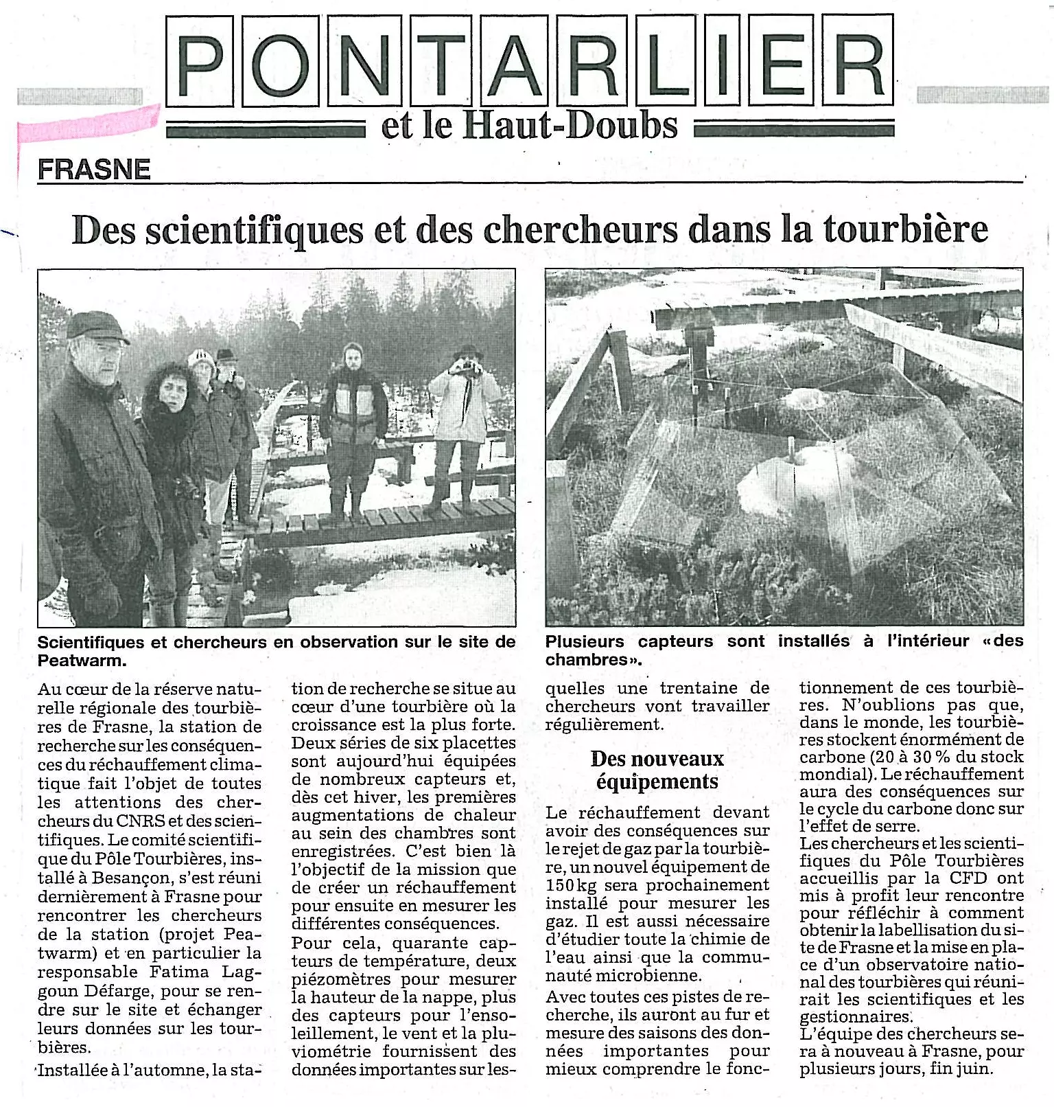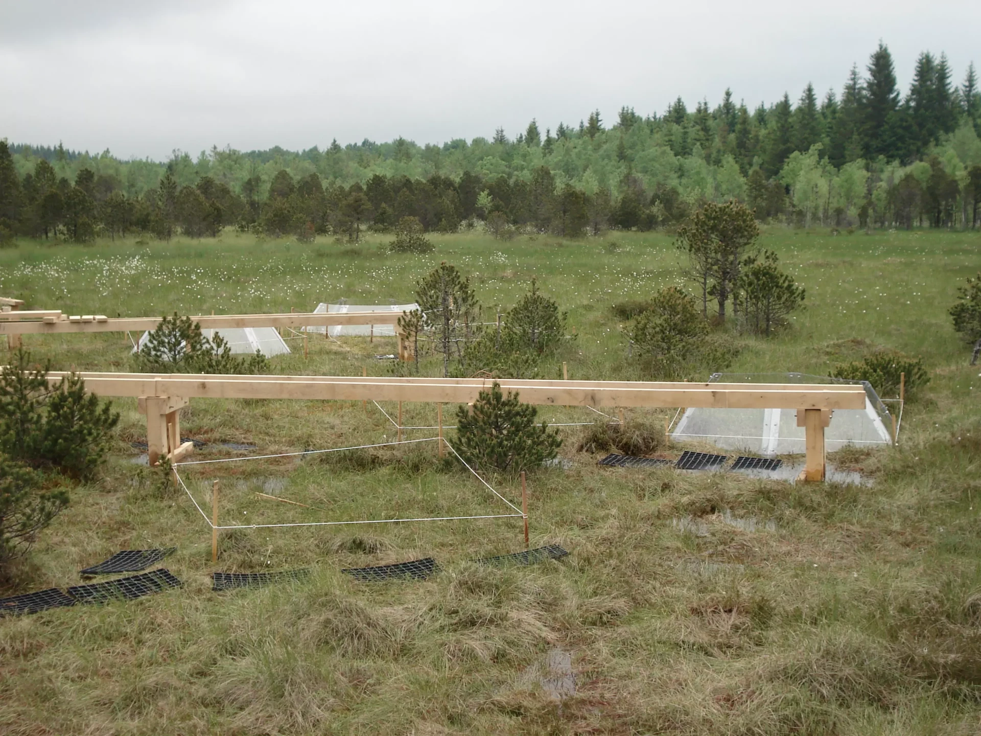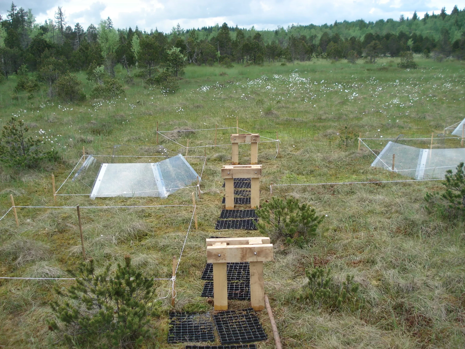 Le dispositif expérimental de réchauffement in situ (tourbière de Frasne, Doubs) est constitué de 12 placettes dont 6 avec mini chambres hexagonales à toit ouvert (Open-Top Chambers « OTCs », protocole standardisé ITEX), appliqué pour la première fois en zone tempérée. Deux types de biotopes à régime hydrique contrasté ont été étudiés : haut-marais et marais de transition, plus humide. Les placettes ont été équipées de capteurs de température (air et sol) et de niveau de nappe et des dispositifs de suivi de végétation et des gaz. Quatre chambres automatiques de mesure de CO2 ont été mises au point et déployées sur le site en 2010 et 2011.