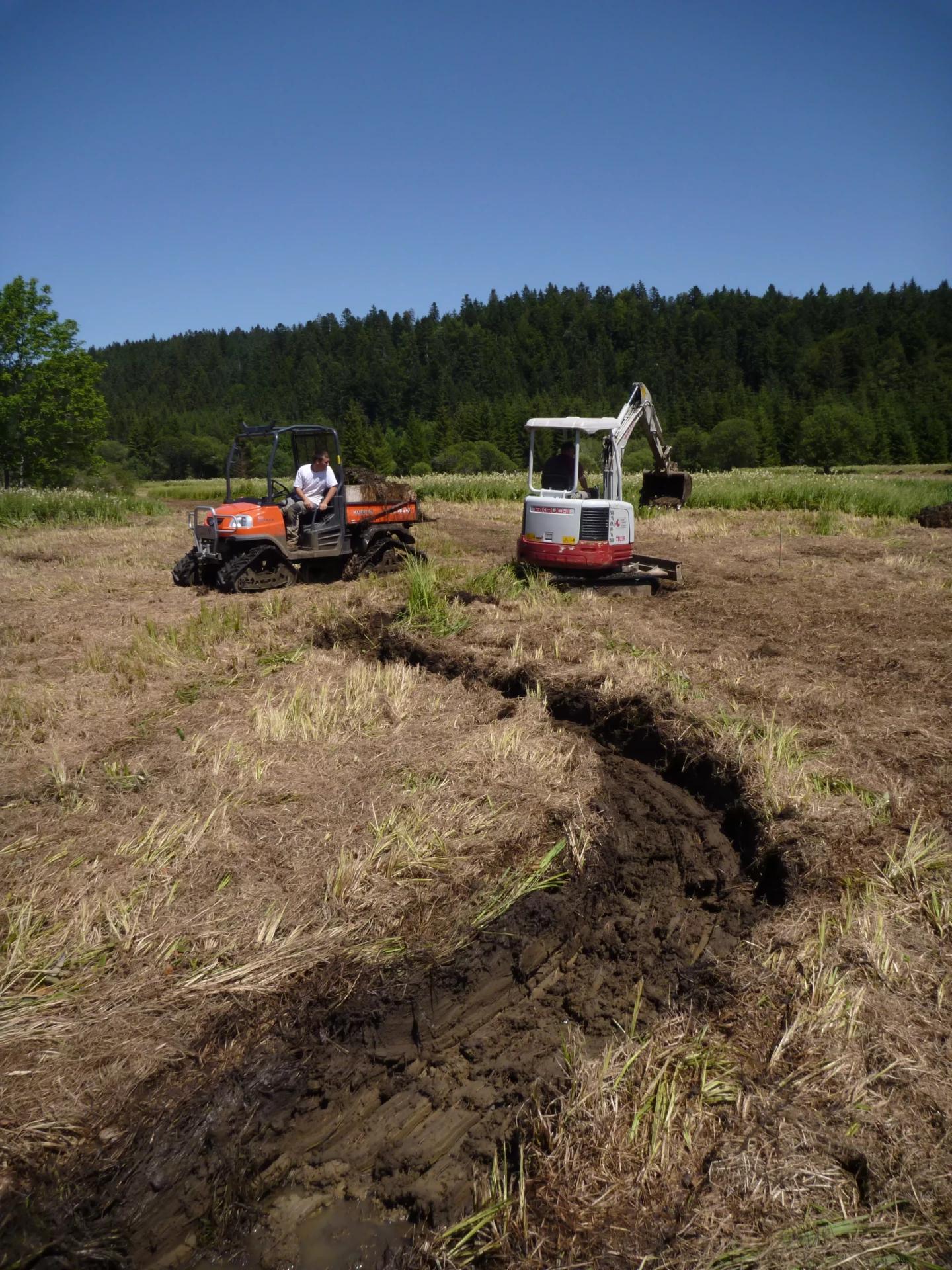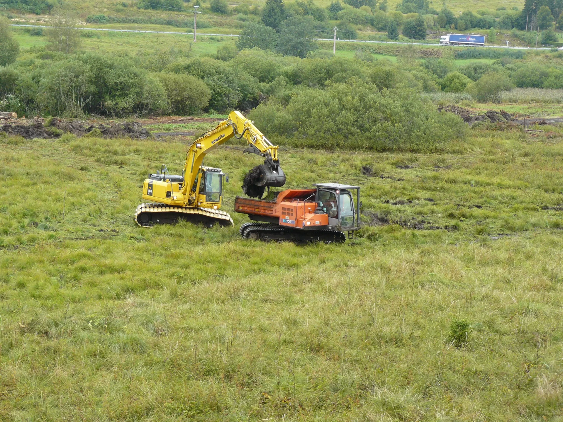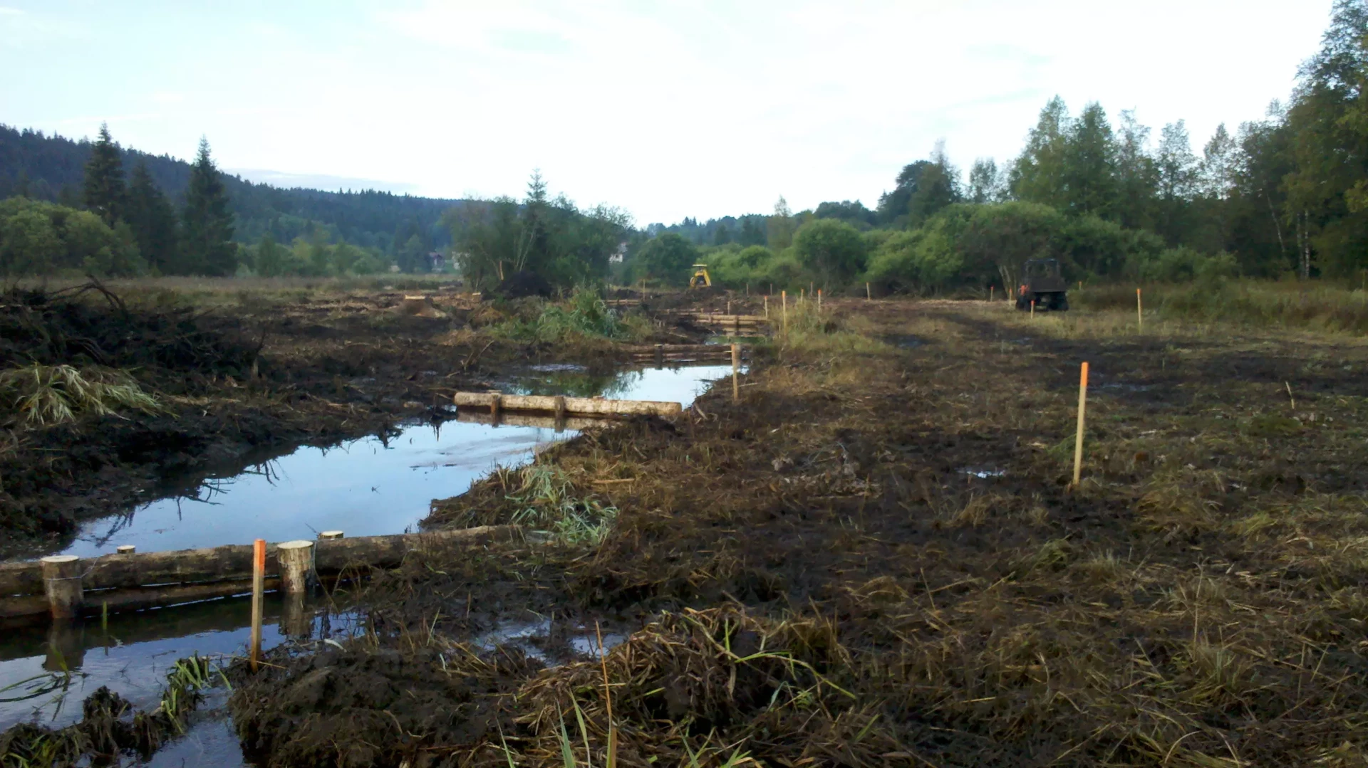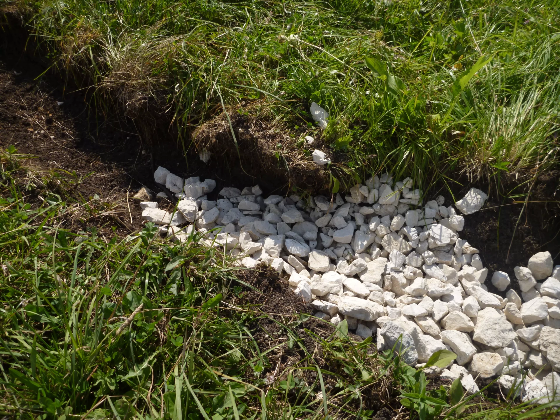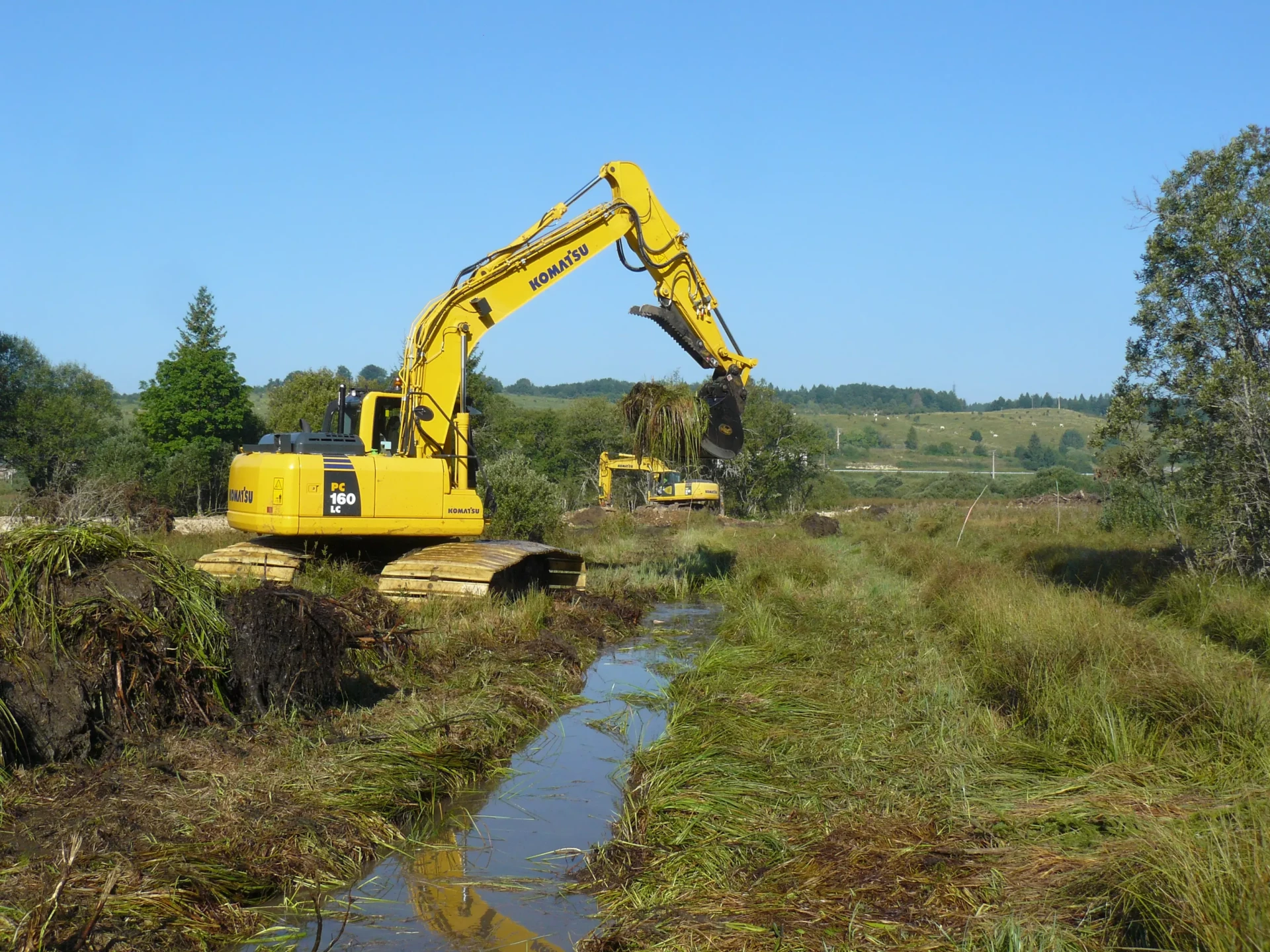 Les anciens tracés ont été neutralisés par le comblement de 1 500 ml de fossés de drainage et 5 500 m³ de lits rectifiés, avec pose de 65 fascines mortes et apport ponctuel de 50 tonnes de gravier et petits blocs pour structurer le nouveau cours d’eau.