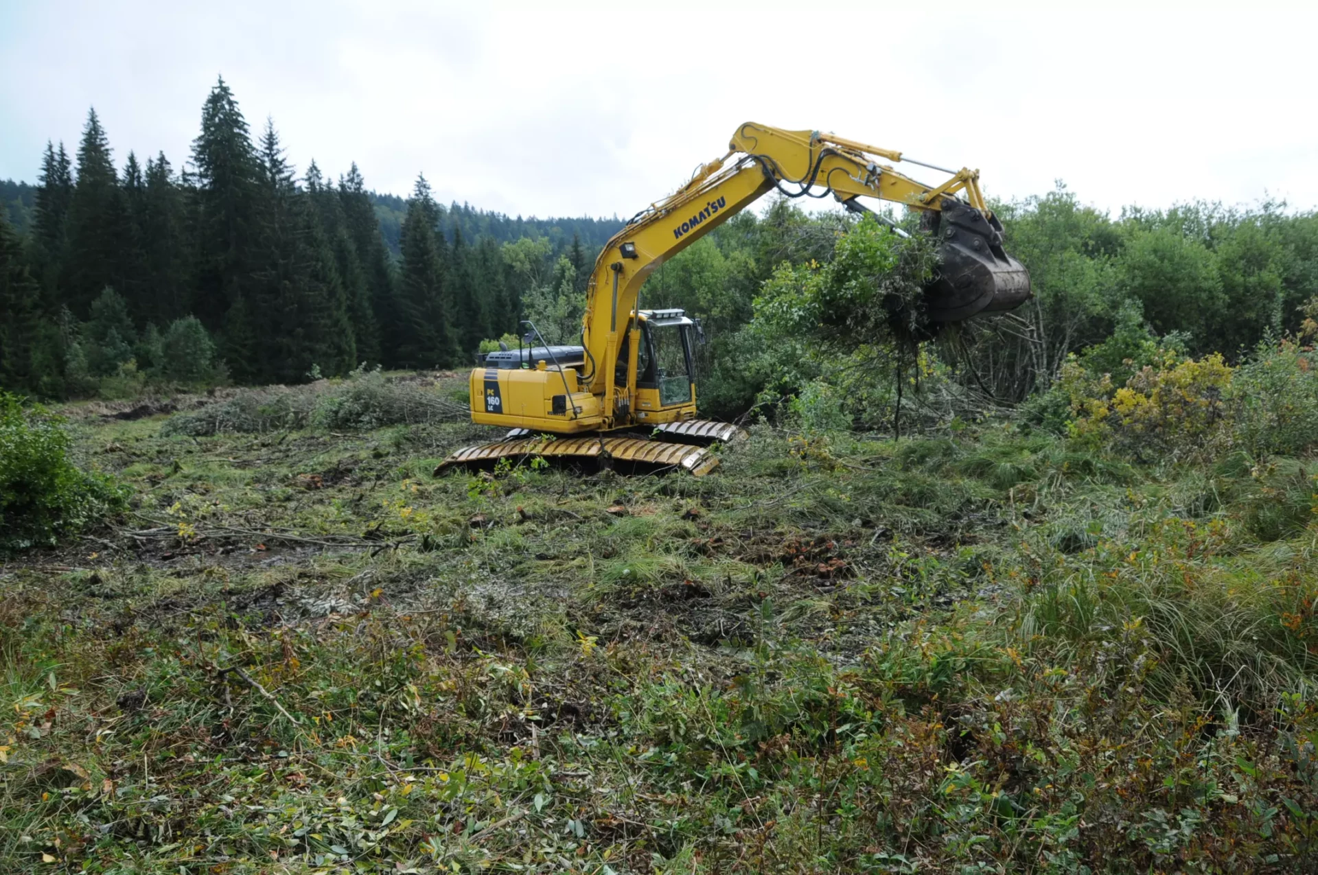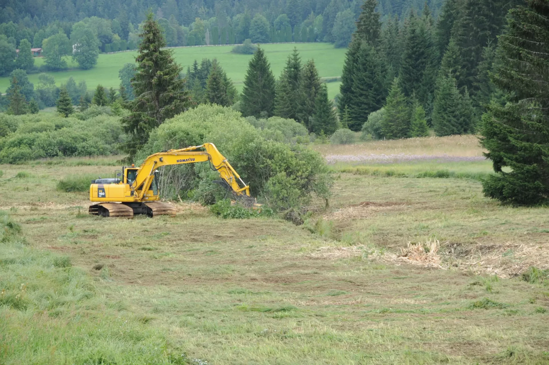 Les travaux ont débuté par le broyage et l’arrachage de souches sur 1 hectare de saulaie dense. Le reméandrement de la Lemme sur 2 000 ml et d’un affluent sur 800 ml a permis de retrouver les tracés d’origine identifiés par télédétection aéroportée et relevés cadastraux. Le nouveau lit a été creusé volontairement sous-dimensionné avec des berges verticales pour permettre une érosion naturelle progressive.
