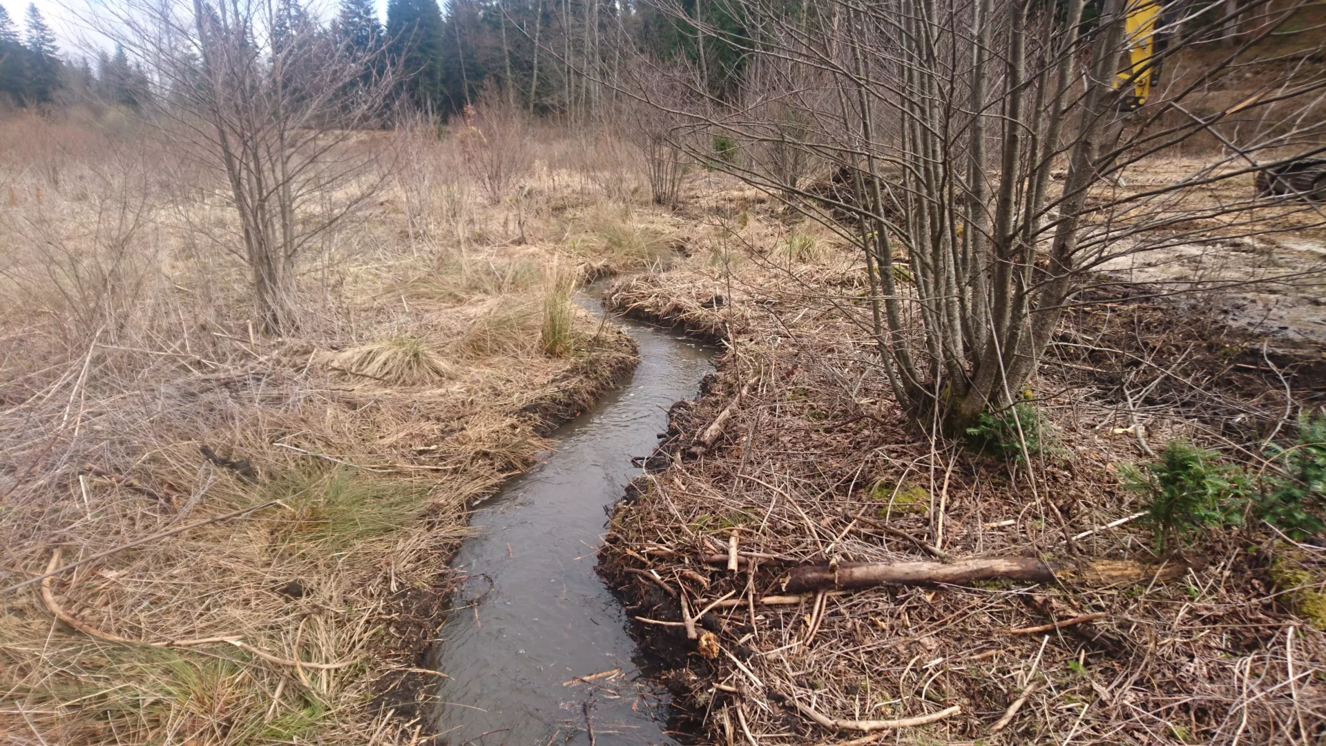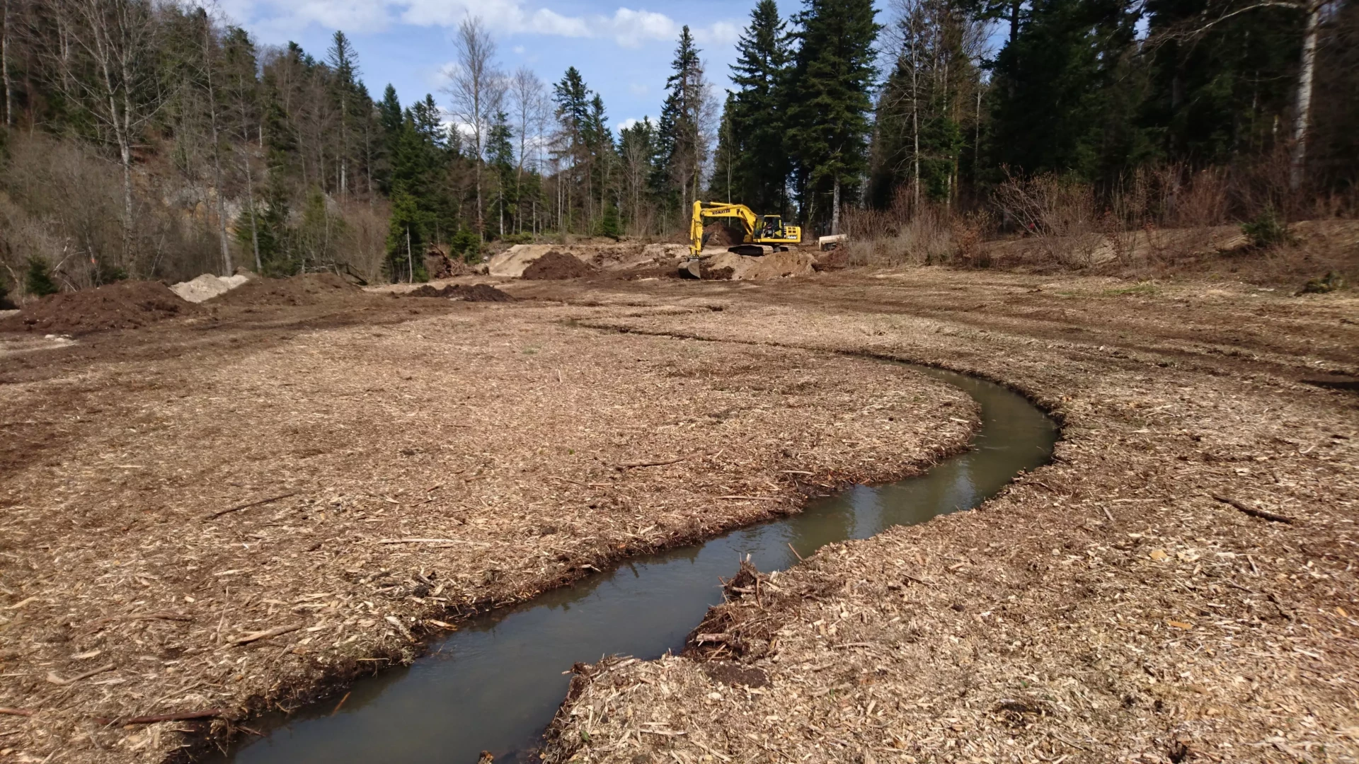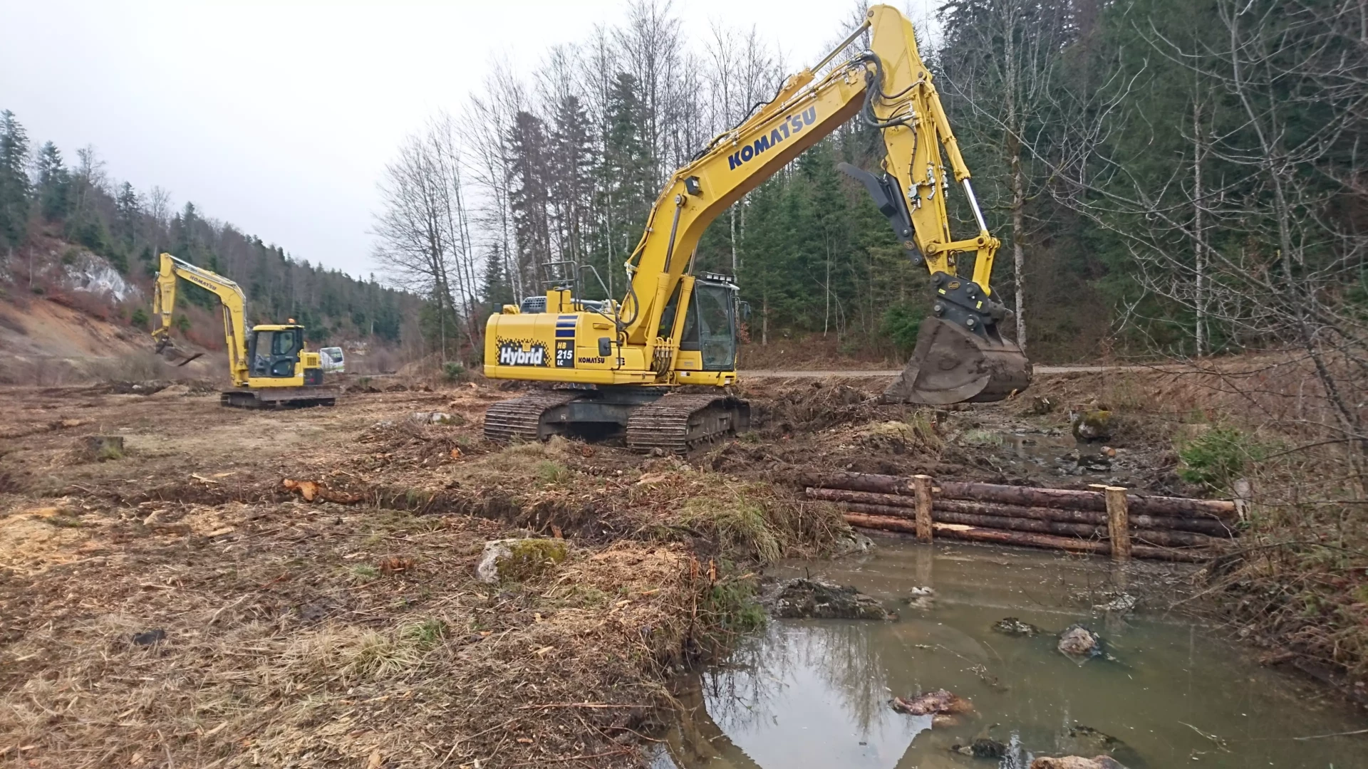 Intervention au moyen de matériel spécifique au travail en marais (pelle marais et Dumper marais, ou travail sur plateaux pour la répartition des charges).