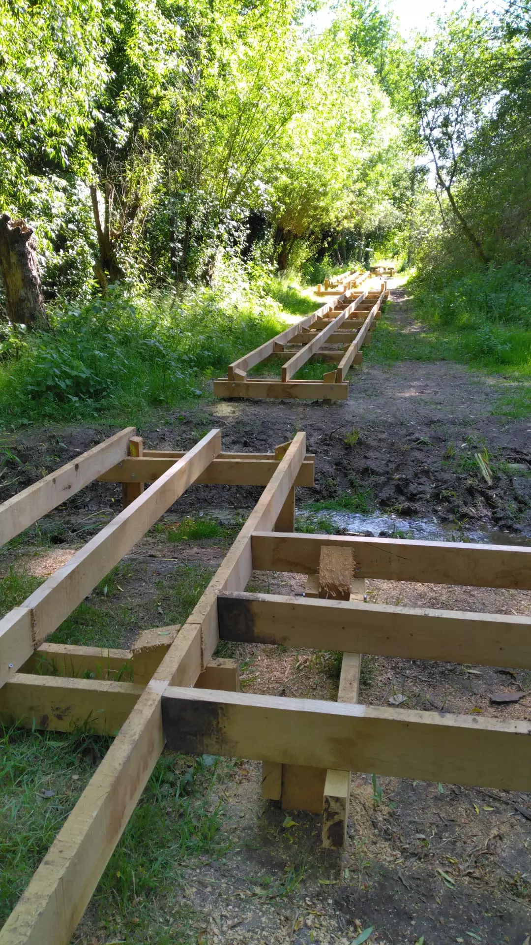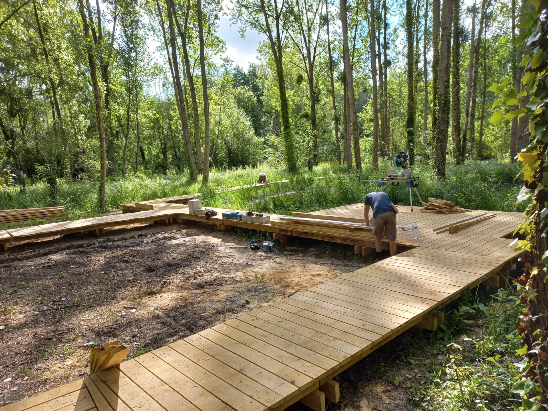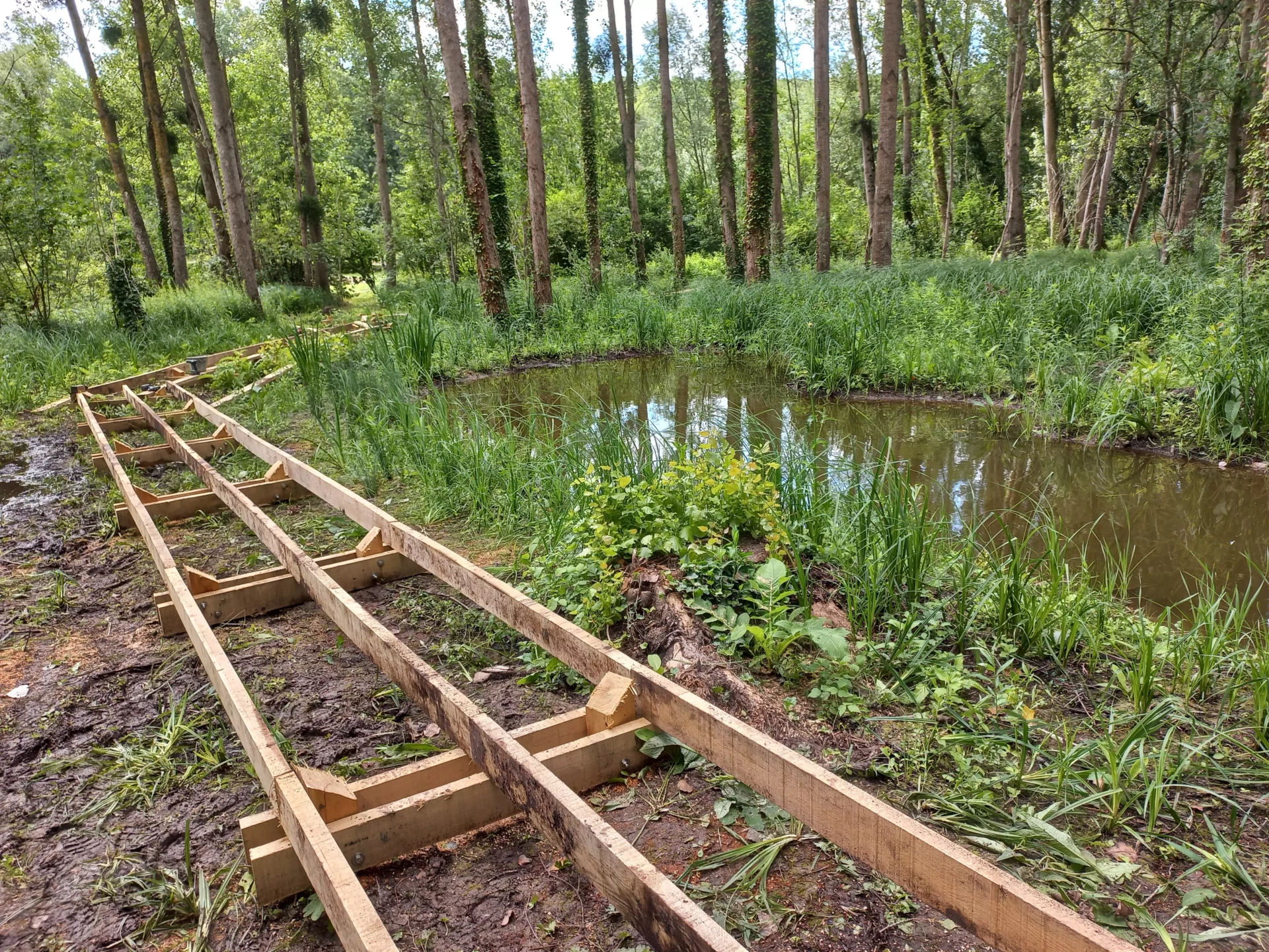 Après sécurisation des accès et démantèlement du platelage existant, le nouveau sentier sur pilotis a été construit avec une largeur de 1,30 m et une hauteur de 30 cm par rapport au sol.