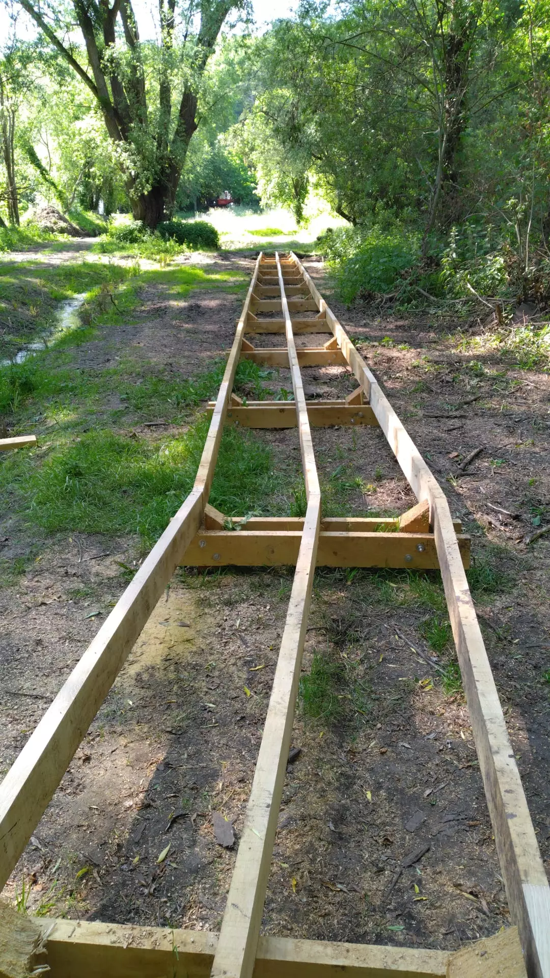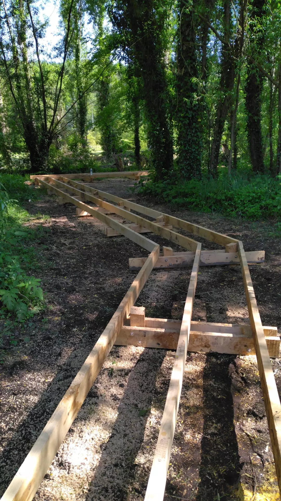 Pour garantir des angles harmonieux, les lames ont été prédécoupées en « queue de pie » créant un balancement régulier avec un espacement constant et un aspect visuel soigné. La sécurisation du parcours a été assurée par deux chasse-roues fil d’Ariane en chevrons fixés de chaque côté par boulons à bois.