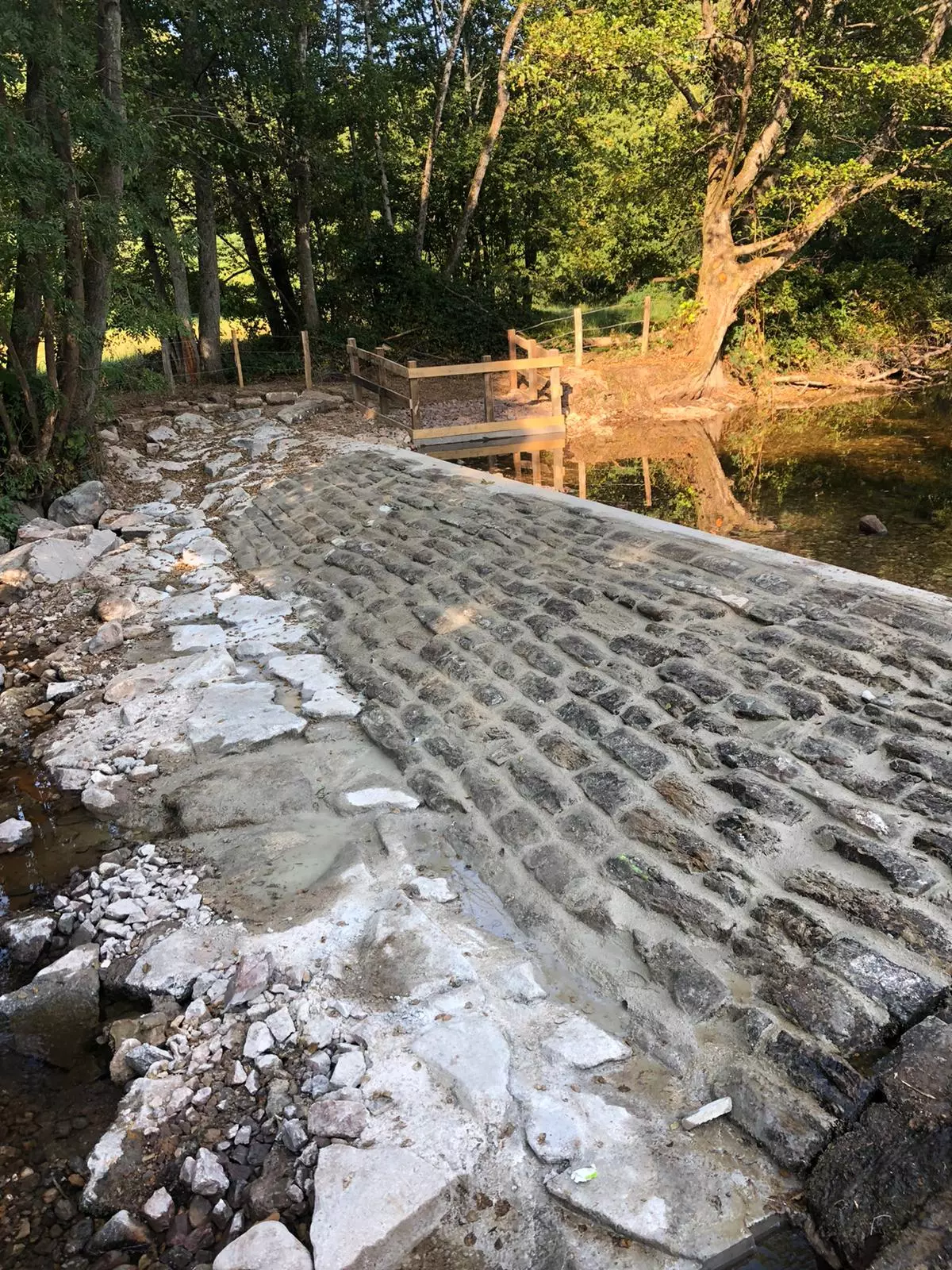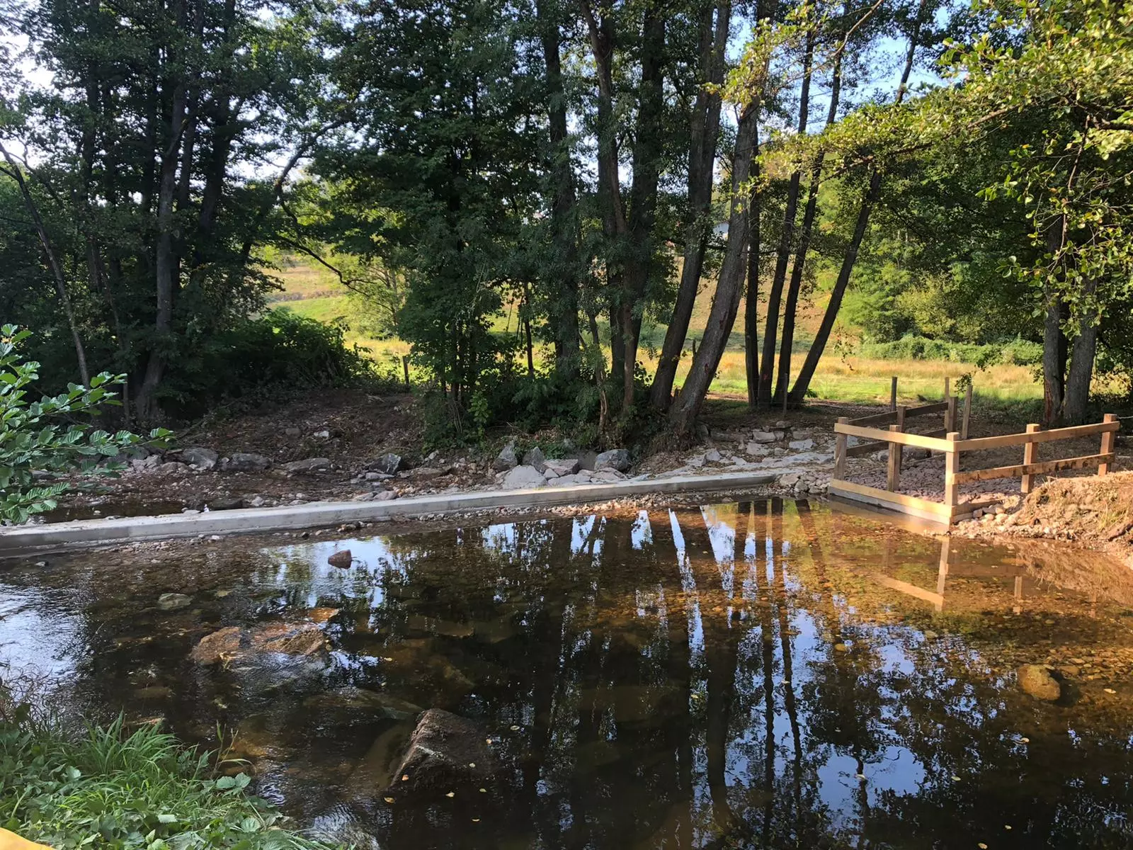 La reprise du seuil existant a nécessité le colmatage de la brèche en rive droite, la mise à niveau de la crête de l’ouvrage et la création d’une bêche d’ancrage. Un abreuvoir avec enrochements et barrière bois a été installé pour le bétail.
