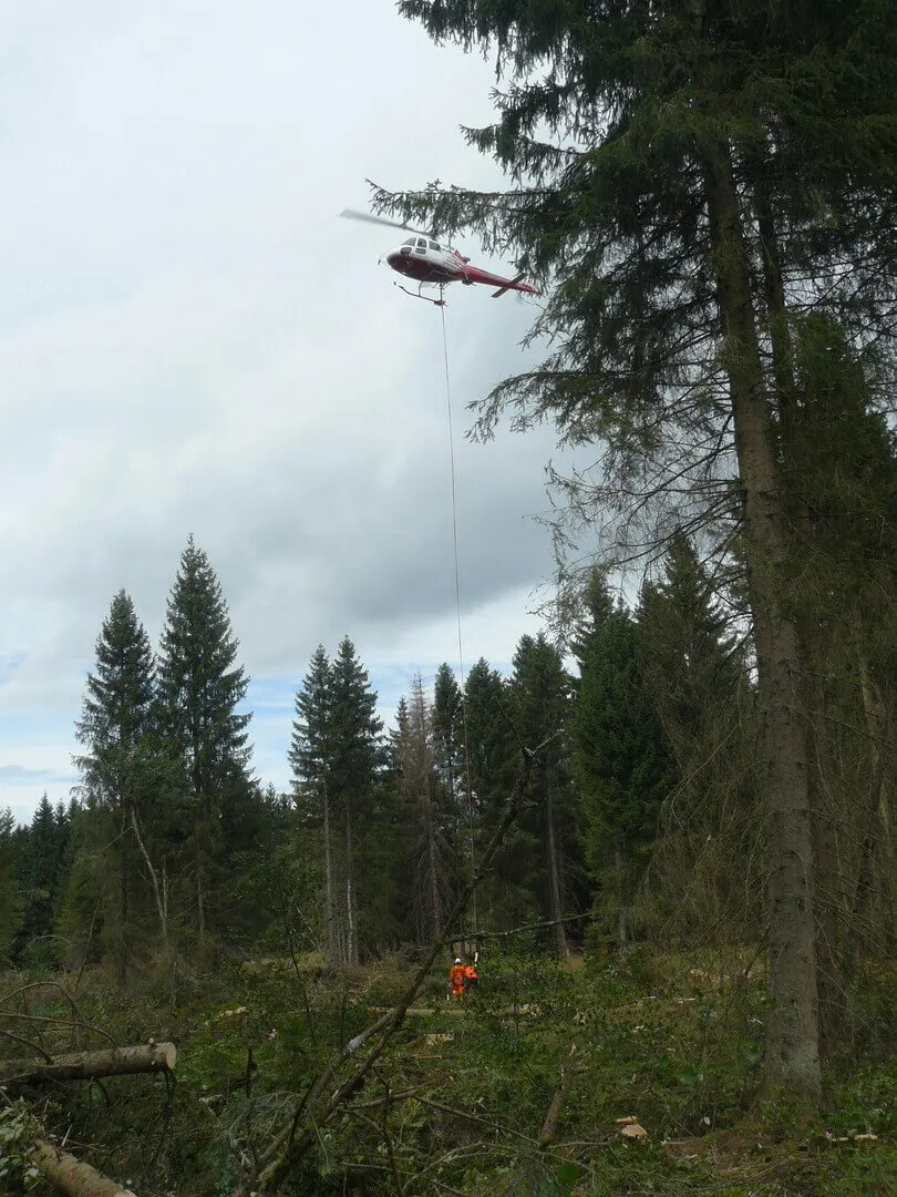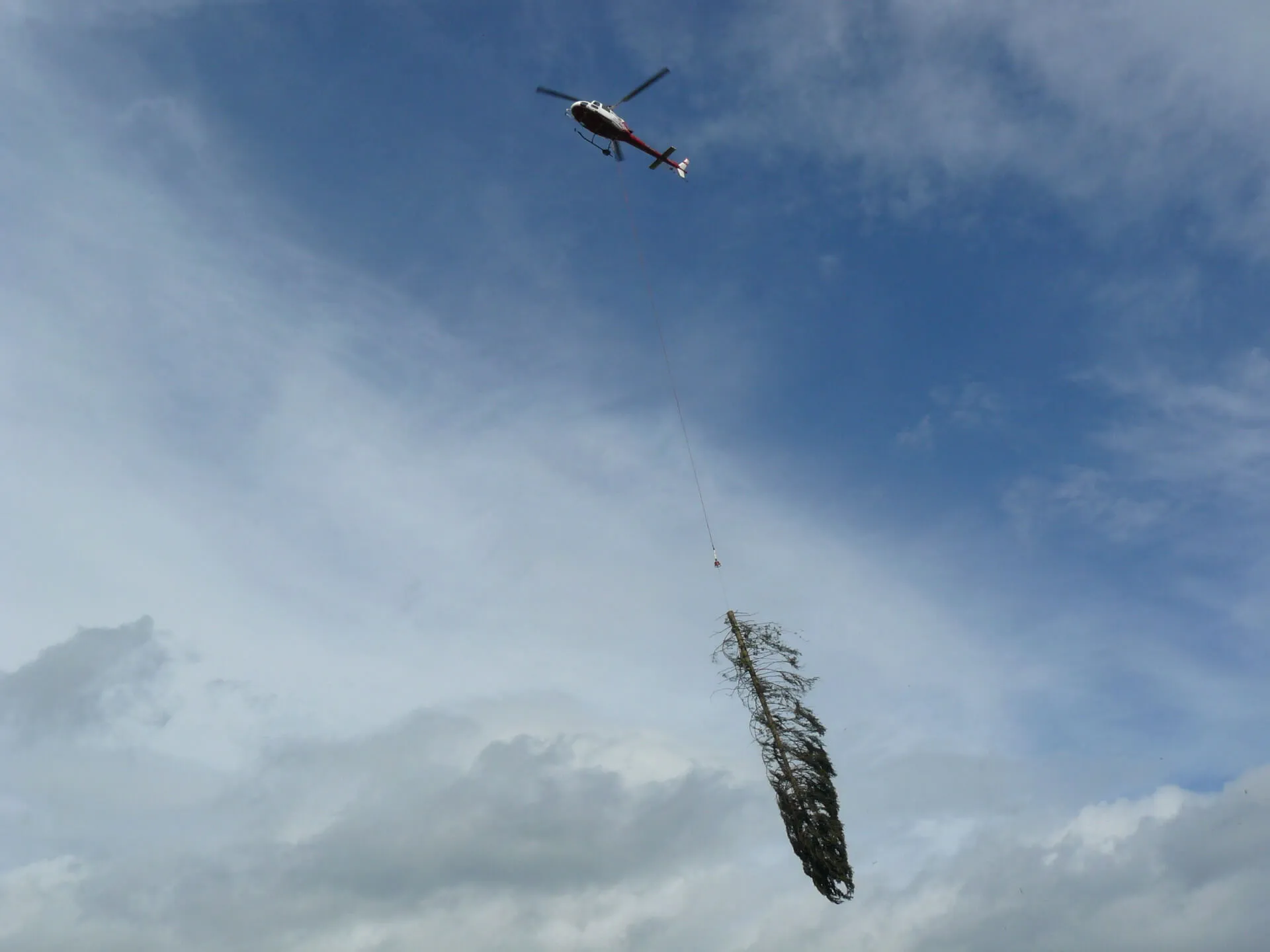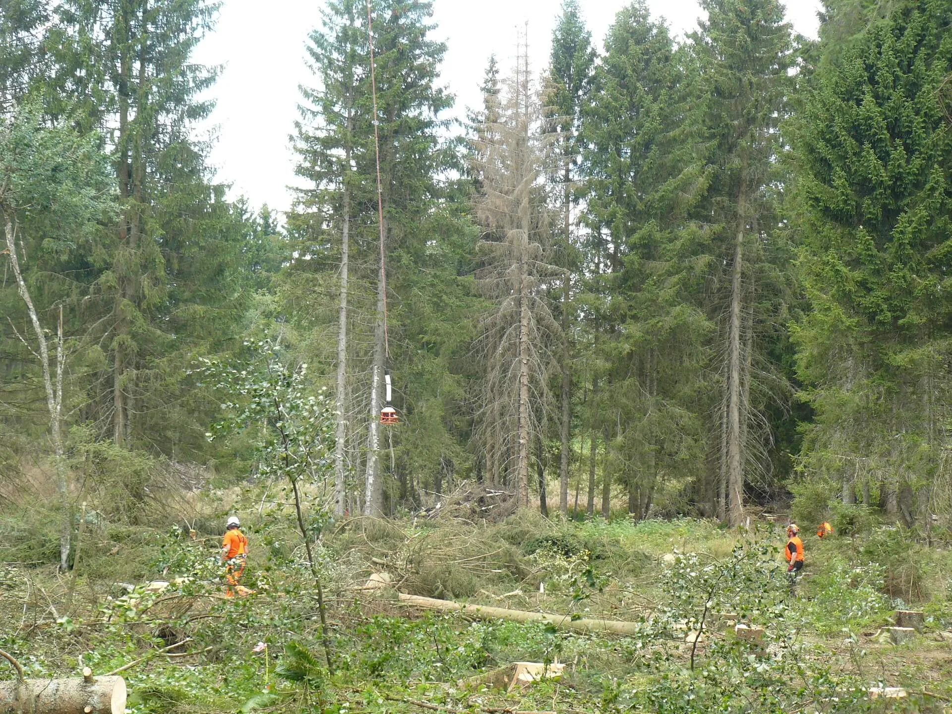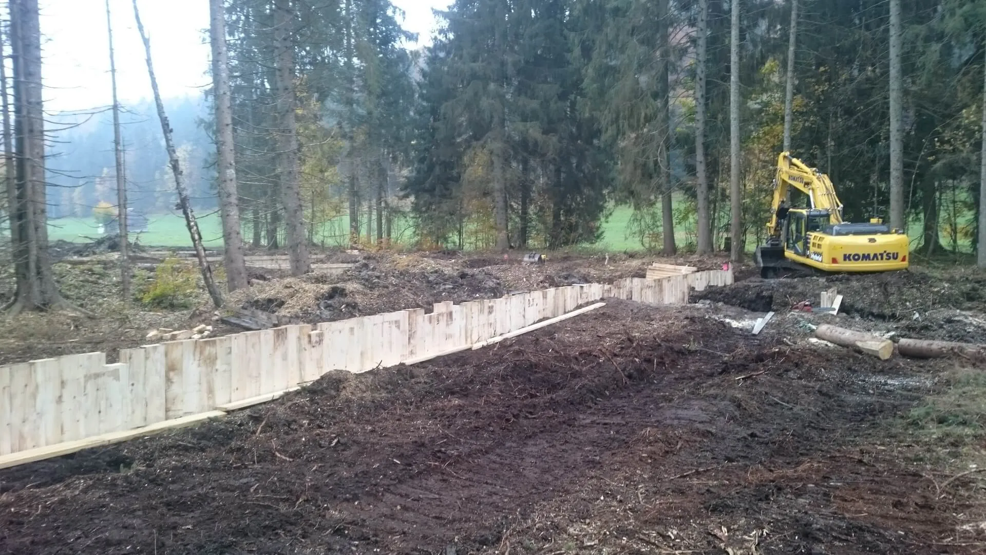 Les travaux ont débuté par le dégagement des accès, le rognage des souches et l’évacuation d’une partie du bois par héliportage. L’approvisionnement des palissades a été réalisé au moyen de dumper et de transporteur à chenilles pour accéder aux zones sensibles du marais.