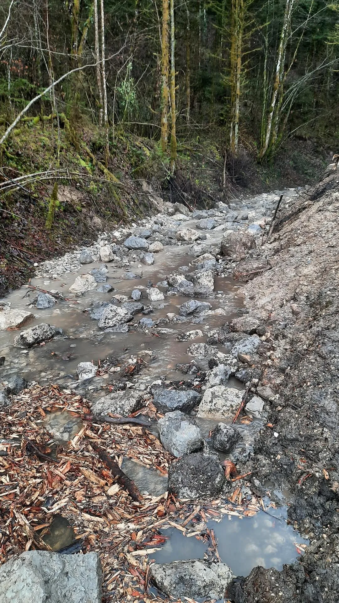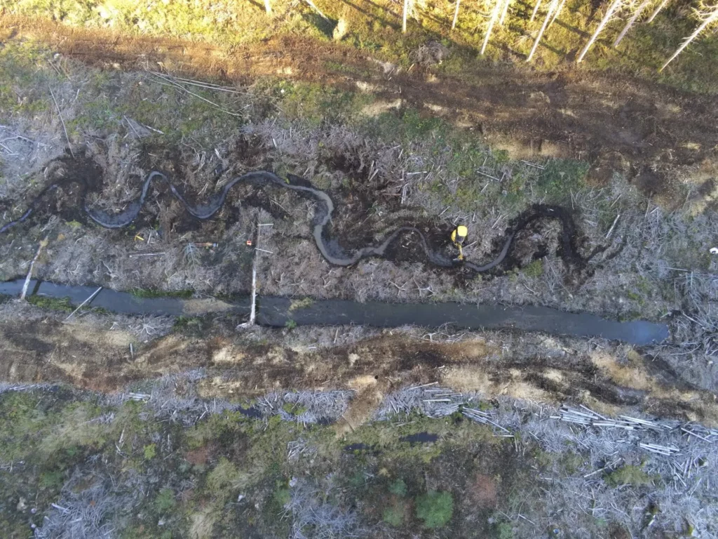 Le reméandrement du ruisseau sur 250 mètres linéaires s’est déroulé en deux passes : un premier creusement au godet de faible largeur pour tracer le nouveau lit, puis un second passage au tilt orientable pour façonner des berges en pentes douces. L’ancien tracé et les drains ont été comblés avec 750 m³ de matériaux, et des fascines en épicéa ont été installées.