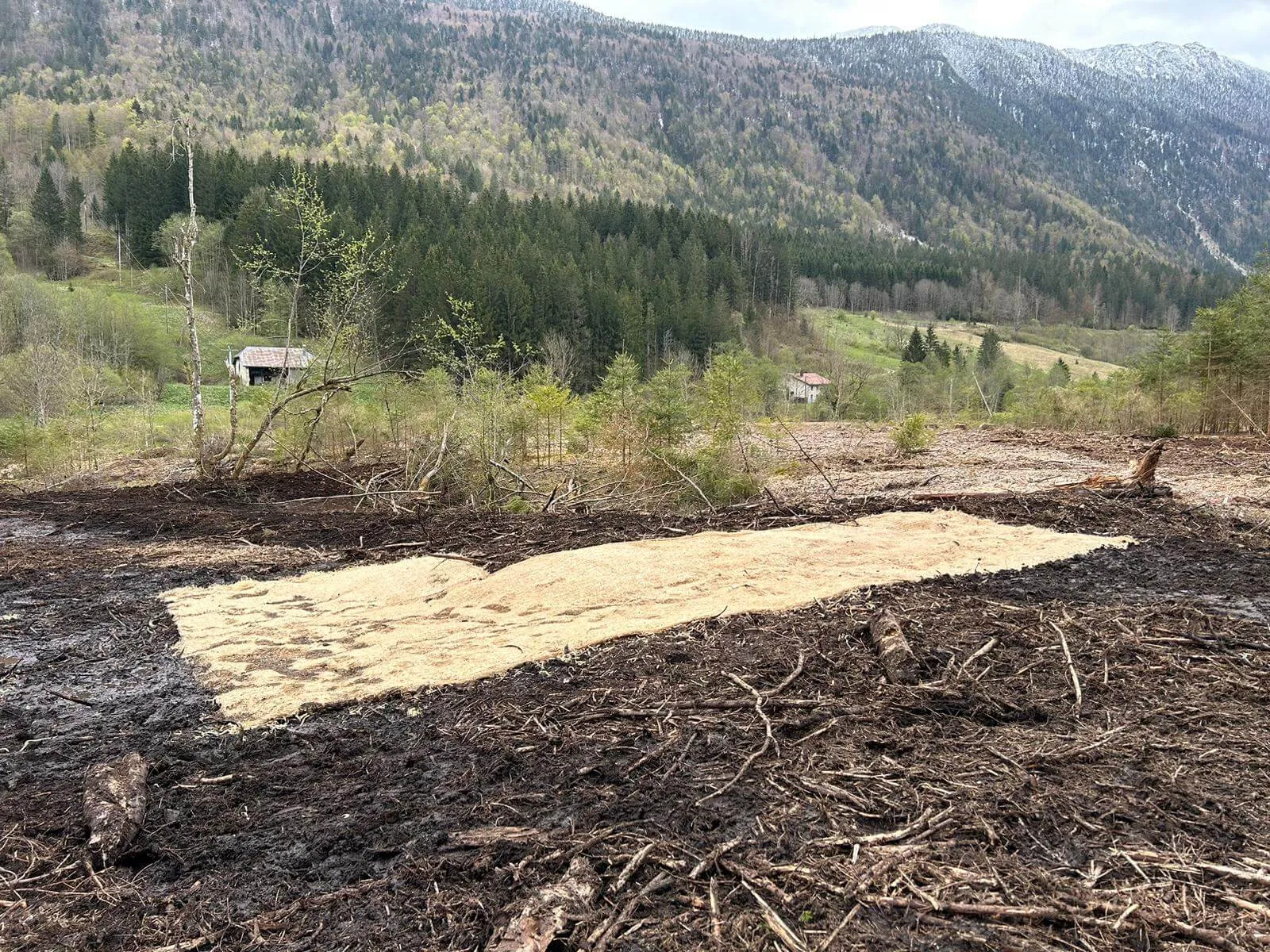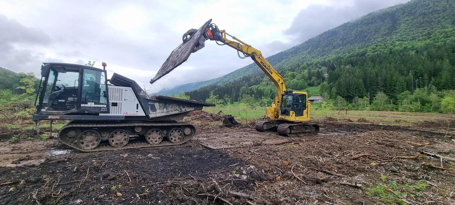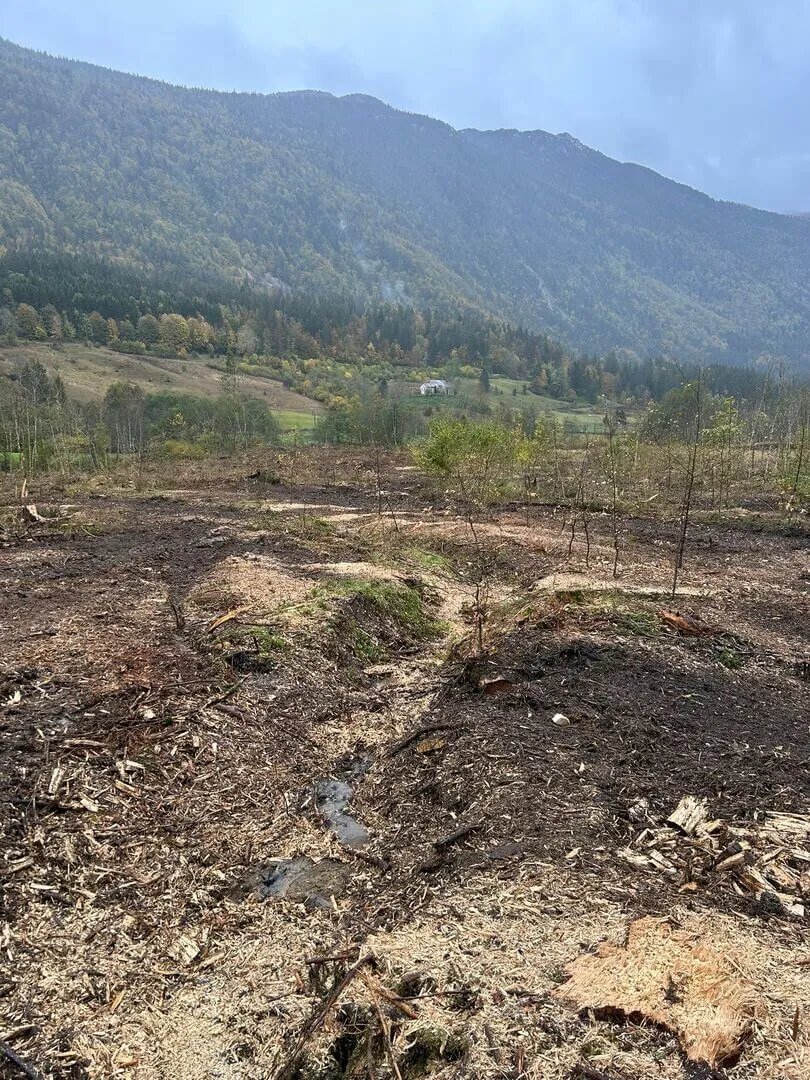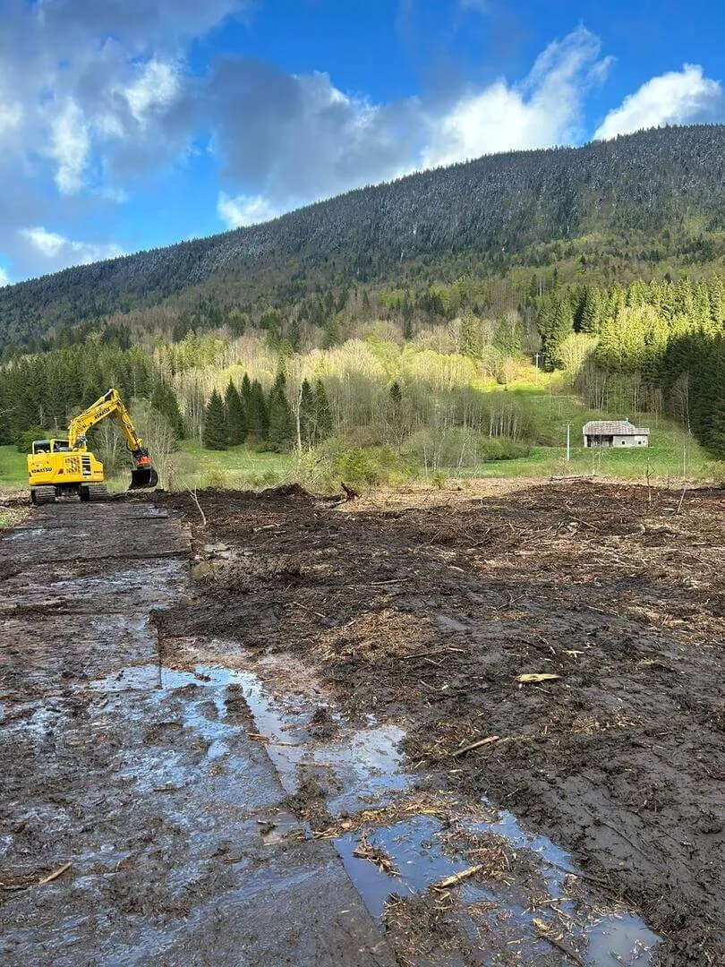 Dessouchage partiel et broyage des souches et rémanents réalisés au broyeur Prinoth Raptor 300, avec mise en stock des matériaux.