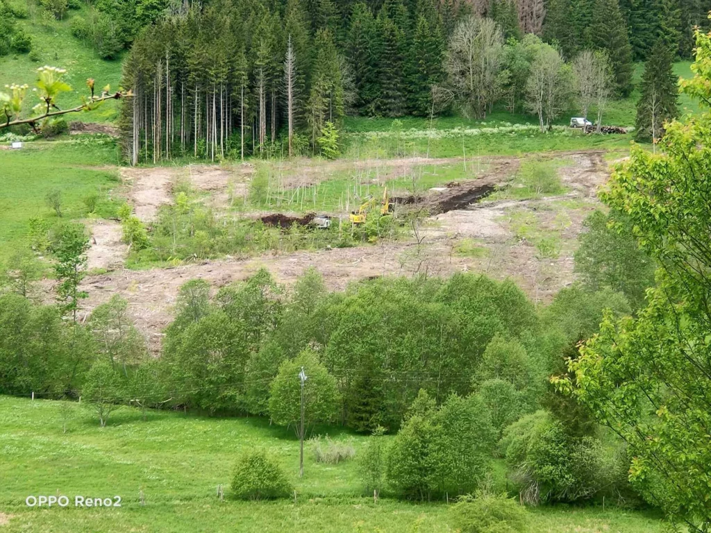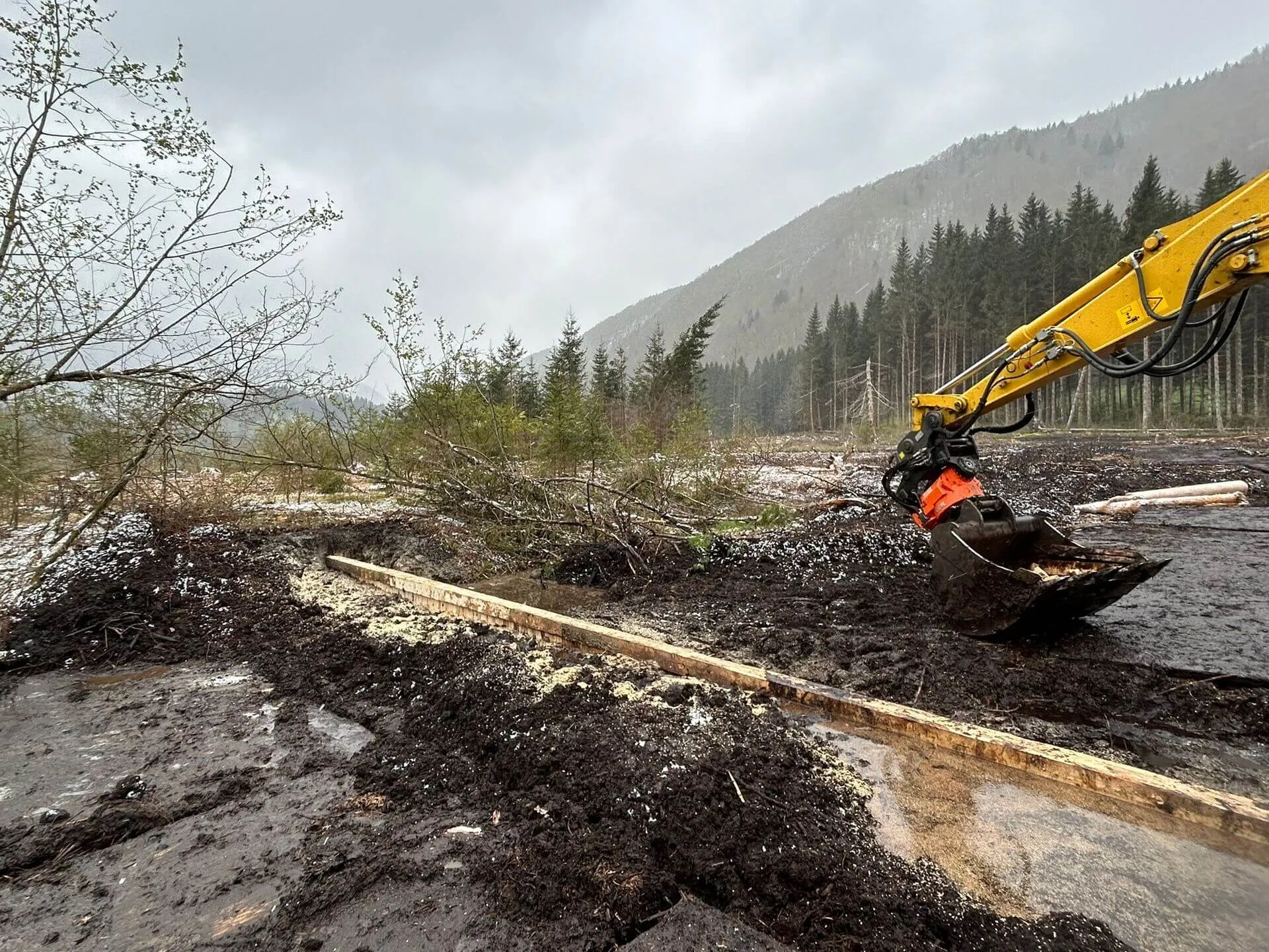 Phase 1 : Déboisement quasi-total de la tourbière avec abattage mécanisé par abatteuse en sous-traitance.