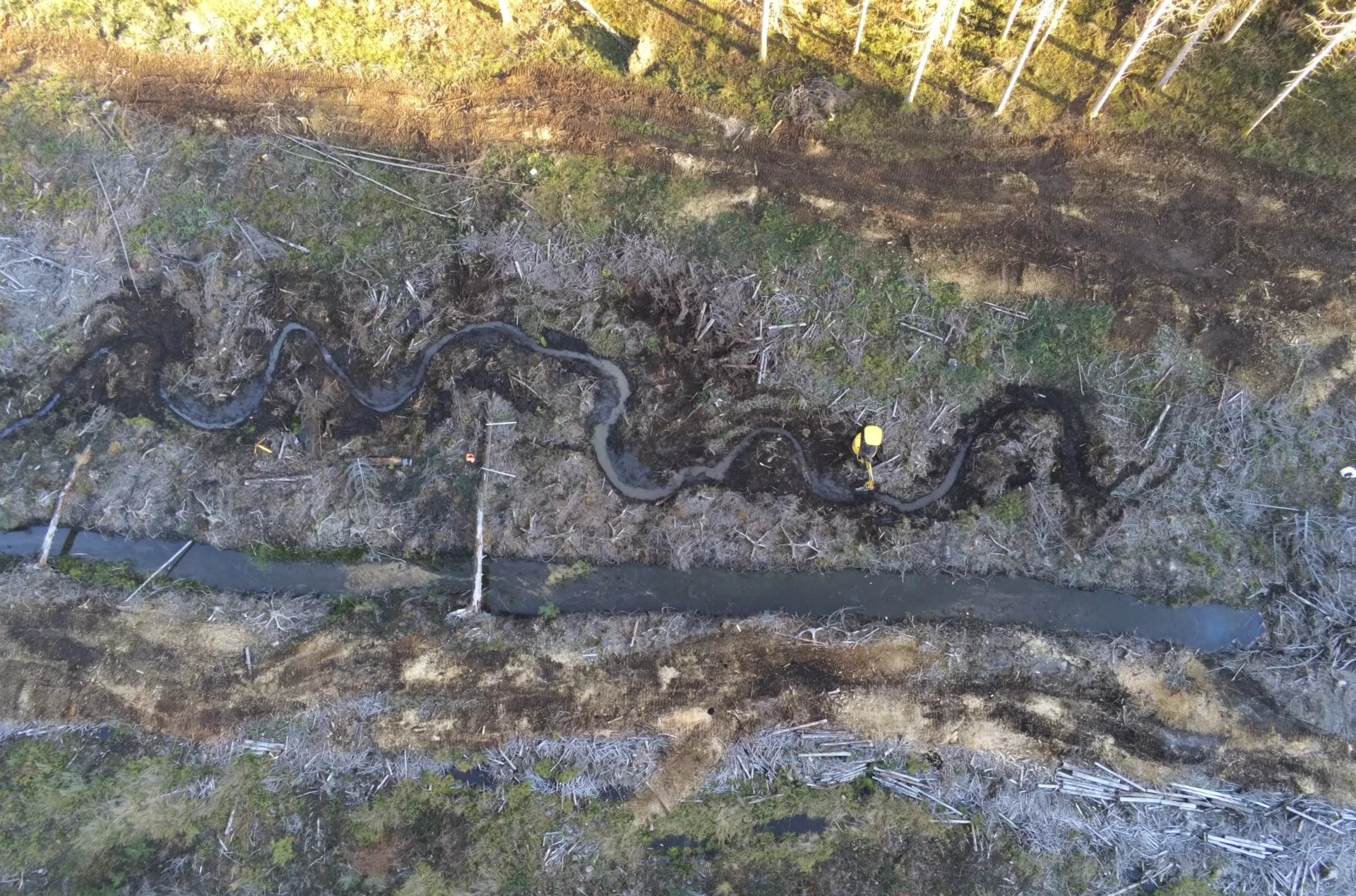 Un chantier de reméandrement consiste à recréer des méandres sur un tracé rectifié, en recreusant un nouveau lit sinueux et en comblant l’ancien.